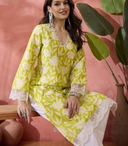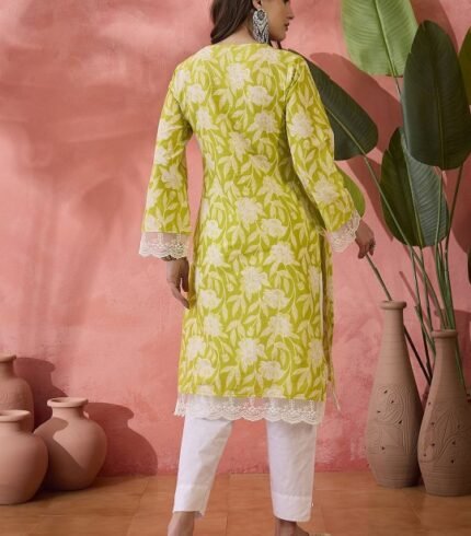 Black Floral Printed V-Neck Thread Work Pure Cotton Straight Kurta