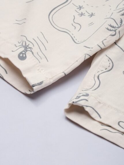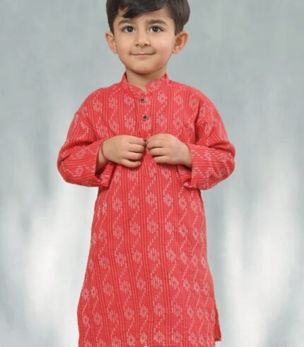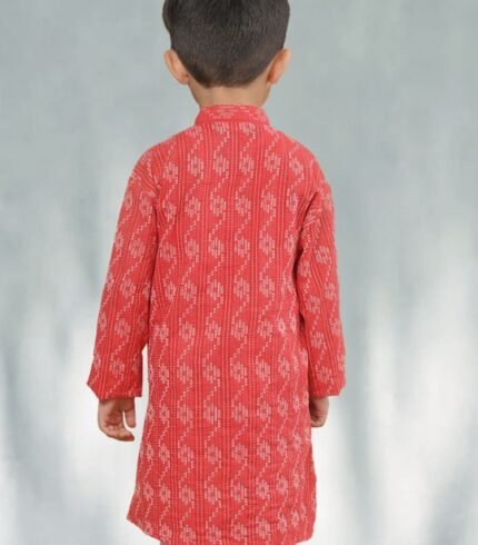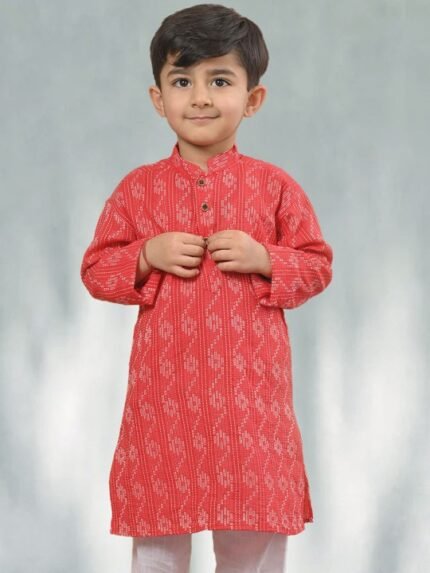 Boys Red & White Floral Printed Mandarin Collar Pure Cotton Straight Kurta