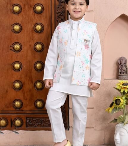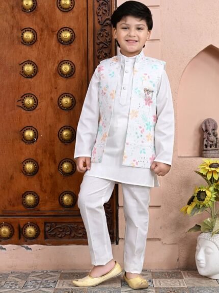 Boys Band Collar Straight Kurta With Pyjamas And Jacket