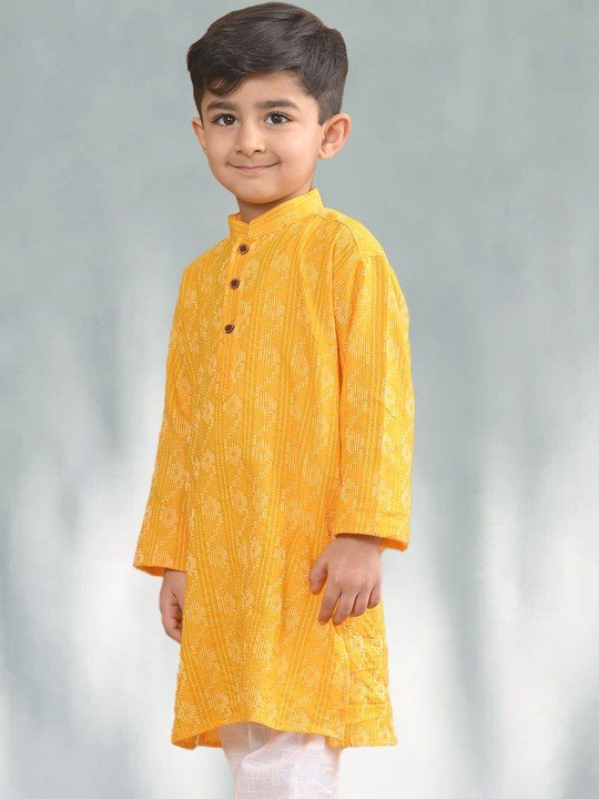 Boys Yellow Woven Design Mandarin Collar Straight Kurta